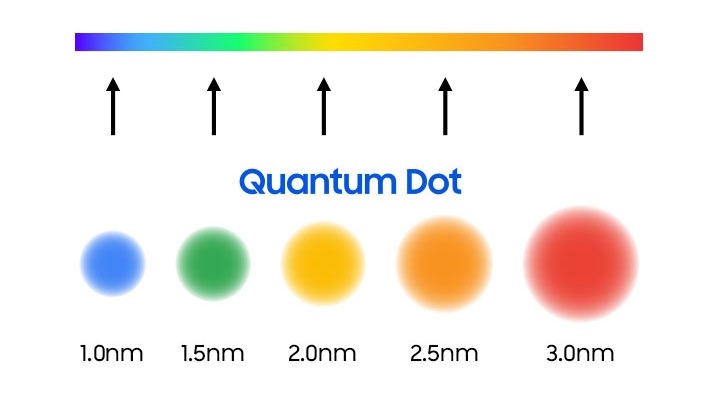 Quantum Dots adalah bahan semikonduktor sangat halus dengan ukuran skala nano. Titik-titik kecil ini menghasilkan warna cahaya yang berbeda tergantung pada ukuran partikelnya - partikel yang lebih besar memancarkan warna merah sedangkan partikel yang lebih kecil memancarkan warna biru. Titik-titik ini memancarkan cahaya berwarna yang tepat karena ukuran partikelnya menyesuaikan dengan kecepatan tingkat kuantum, sehingga menghasilkan emisi cahaya yang akurat dan efisien.