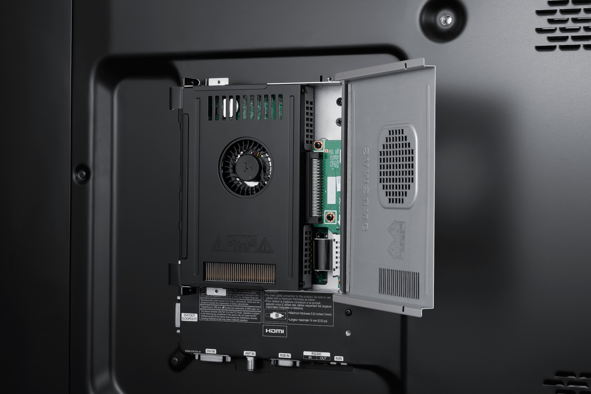 The compact, lightweight Samsung Plug-in Module PC option fits perfectly with our slim-edged LFDs. This ensures that your business displays look sleek and professional. The PIM’s efficient design keeps unit weight and depth to a minimum. Your business display area remains tidy, allowing customers to focus on the message presented to them.