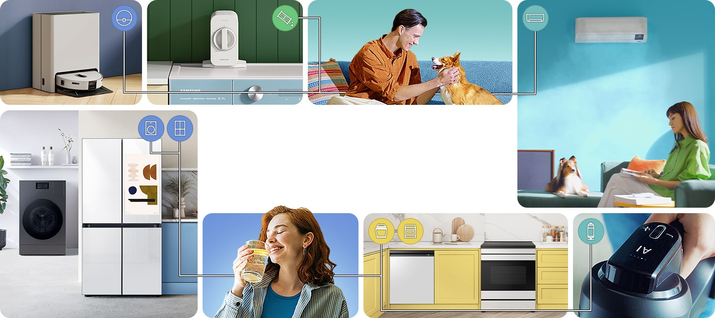 13. Object recognition may be affected by an object’s shape or the environmental conditions. Only certain object types can be recognized. Example items: air conditioner (stand type), refrigerator, BESPOKE (refrigerator/dishwasher), TV, washing machine/dryer, air purifier, AirDresser, sofa, bed, bookshelf, table, pet excrement, electrical cable, towel/sock, cup, glass, bottle, bowl, vase, floor mat, rug, coat rack, shoes, pedestal, scales, power extension, furniture with a crossbar, furniture legs, wheeled chair, pet fur ball, smartphone cable, stain, door step, and doorway. Stained Area Recognition needs to be activated beforehand via the SmartThings App. A Wi-Fi connection and Samsung account are required.