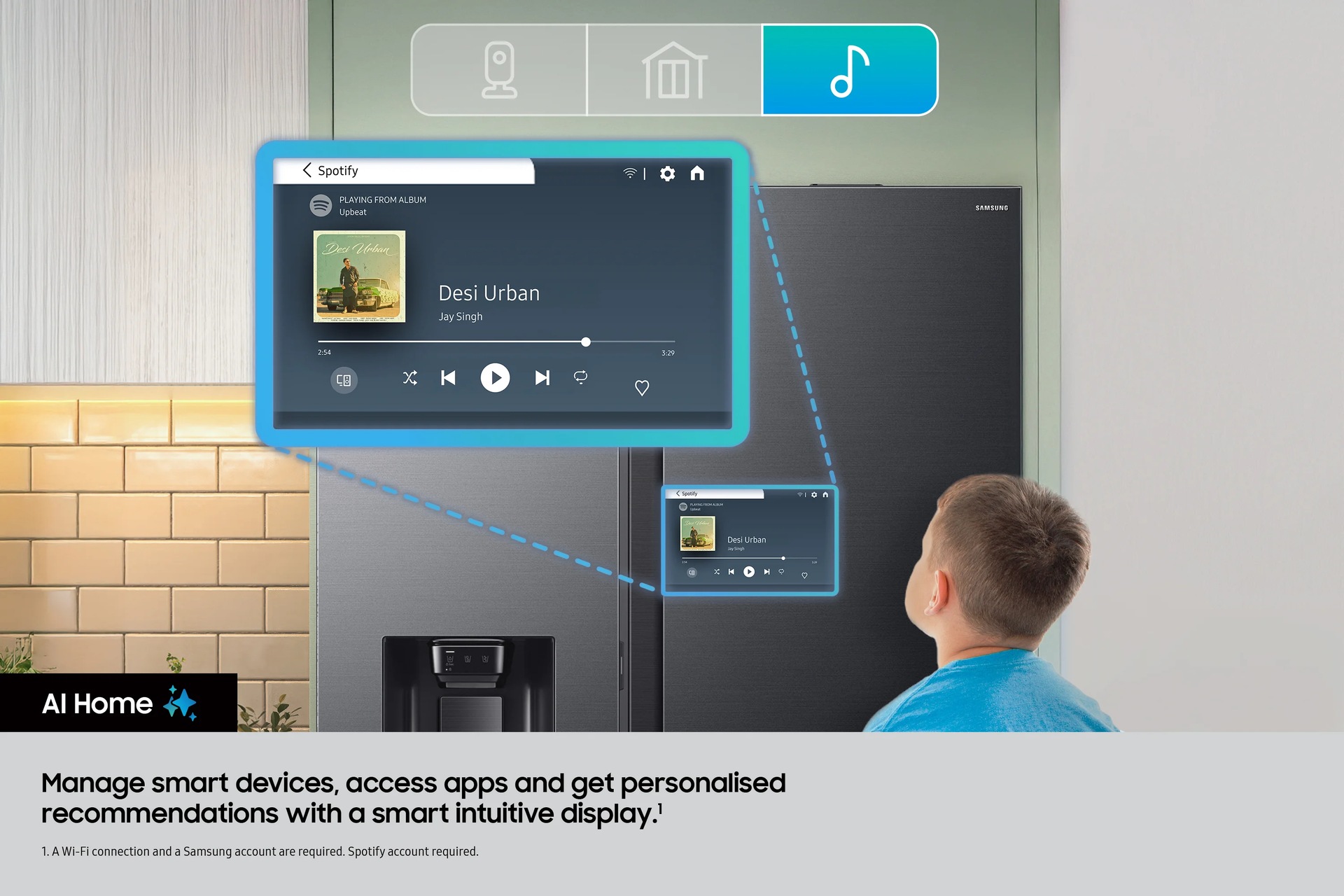 Get smart in your kitchen. The AI Home* with a 9" LCD Touchscreen Display is an intuitive control centre. It lets you manage and control your smart home devices** and access multiple apps. It activates with your touch and provides personalised information, like weather notifications, appointment reminders and recipe suggestions based on the food you take out of the fridge. And built-in voice recognition means you can simply speak commands and ask for information using Bixby***. With built in SmartThings Hub****, control connected devices without extra hardware.