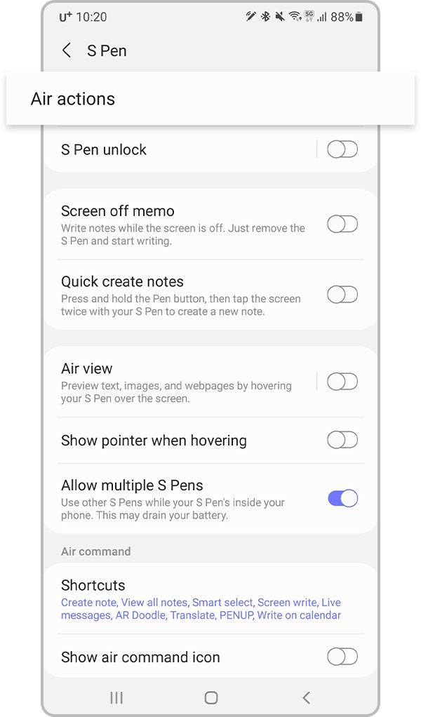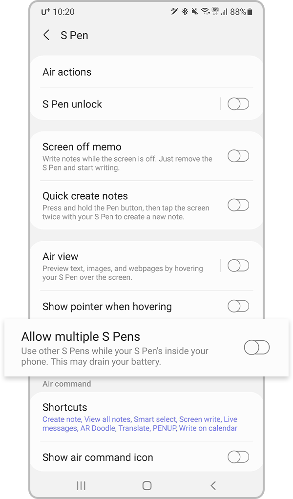 The multiple S Pens feature can sometimes interfere with charging. To turn off this feature, insert the S Pen into your phone until it clicks into place, then follow the steps below.