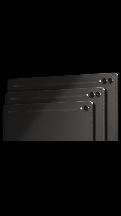 Galaxy Tab S9, S9+ and S9 Ultra in Graphite appear from left to right in Landscape mode, overlapping each other with their back facing forward. Samsung logo is shown on the top left of each device.