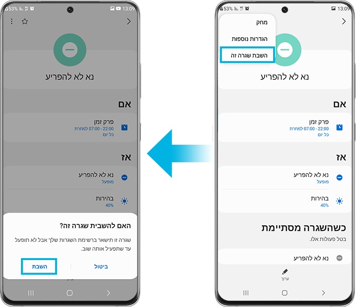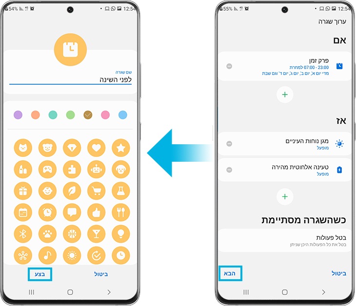 הערה: כברירת מחדל, כשהגורם המפעיל יסתיים, Bixby Routines תעצור את הפעולה ותחזיר את כל ההגדרות שהשתנו למצבן הקודם.