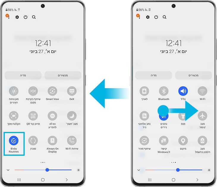 הערה: אם בחלונית המהירה לא מוצג סמל של Bixby Routines, תוכלו להוסיף אותו בהקשה על הסמל +.