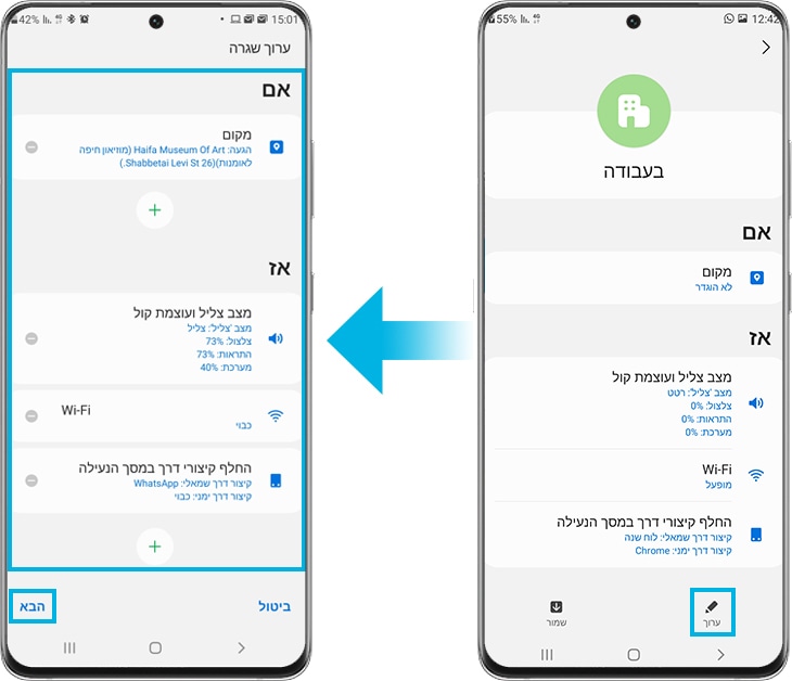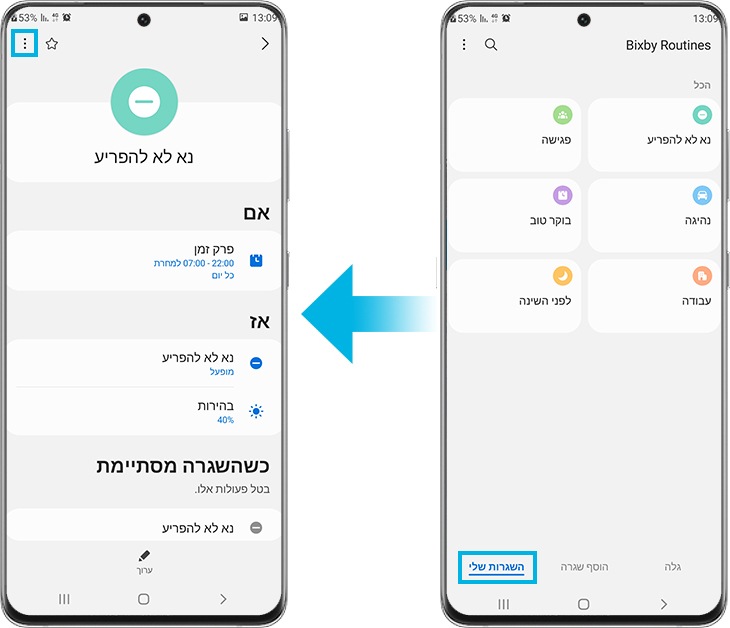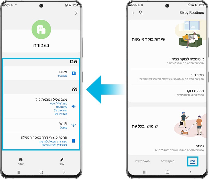 חסכו זמן ומאמץ עם התכונה Bixby Routines במכשיר ה-Galaxy שלכם. Bixby לומדת את דפוסי השימוש שלכם וממליצה על שגרות עבודה אוטומטיות, כדי שלא תצטרכו יותר להשקיע זמן בחזרה על אותן משימות ותהליכי הגדרה. כשתגיעו לעבודה בבוקר, Bixby תוכל להשתיק את צלילי ההתראות ולהפעיל Wi-Fi. לחלופין, כשתלכו לישון, Bixby תוכל להפעיל את מסנן האור הכחול ולהפחית את בהירות המסך. למידע נוסף על התכונה Bixby Routines והשימוש בה, עיינו במדריך הבא.