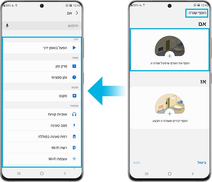 תוכלו גם ליצור שגרות משלכם. תוכלו לבחור מתוך מגוון נרחב של גורמים מפעילים המסוגלים לבצע כמעט כל פעולה במכשיר שלכם. בצעו את הפעולות הבאות כדי ליצור שגרה מותאמת אישית חדשה.