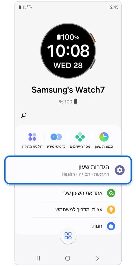 בזמן שהטלפון והשעון שלך מחוברים, אתה יכול להשתמש באפליקציית Galaxy Wearable כדי לבדוק באופן קבוע אם יש עדכונים זמינים.