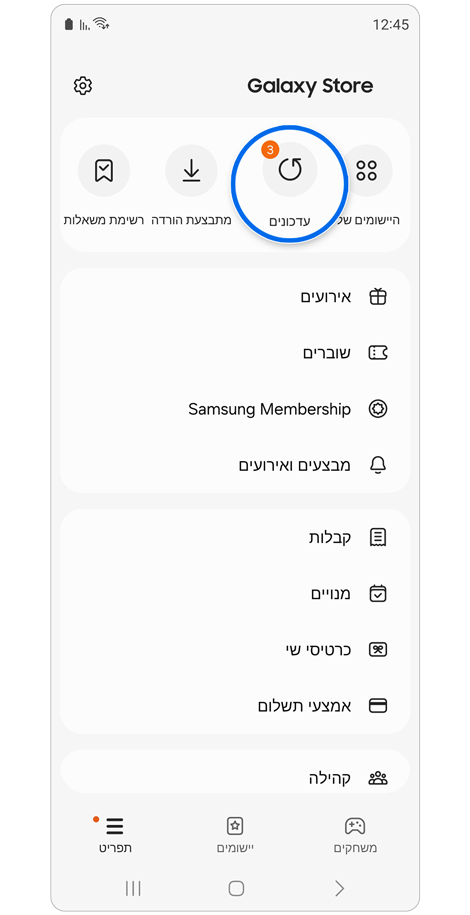 ניתן להשתמש ב-Galaxy Store כדי לעדכן את האפליקציות של השעון שלך. ניתן לעדכן את האפליקציות של השעון באמצעות הטלפון המחובר, או בשעון עצמו. ודא שהטלפון והשעון שלך מחוברים והמכשיר שבו אתה משתמש מחובר ל-Wi-Fi או לנתונים ניידים.