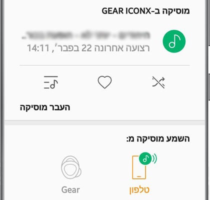 כאשר האוזניות מחוברות לטלפון או לטאבלט באמצעות אפליקציית Galaxy Wearable, פתחו את האפליקציה והקישו על הכרטיסייה מידע. תחת 'השמעת מוזיקה דרך', הקישו על טלפון. כעת כל השמע יופעל ישירות דרך Gear IconX. עדיין תוכלו לענות לשיחות, אבל כל השמע האחר יופעל דרך רמקולי הטלפון.