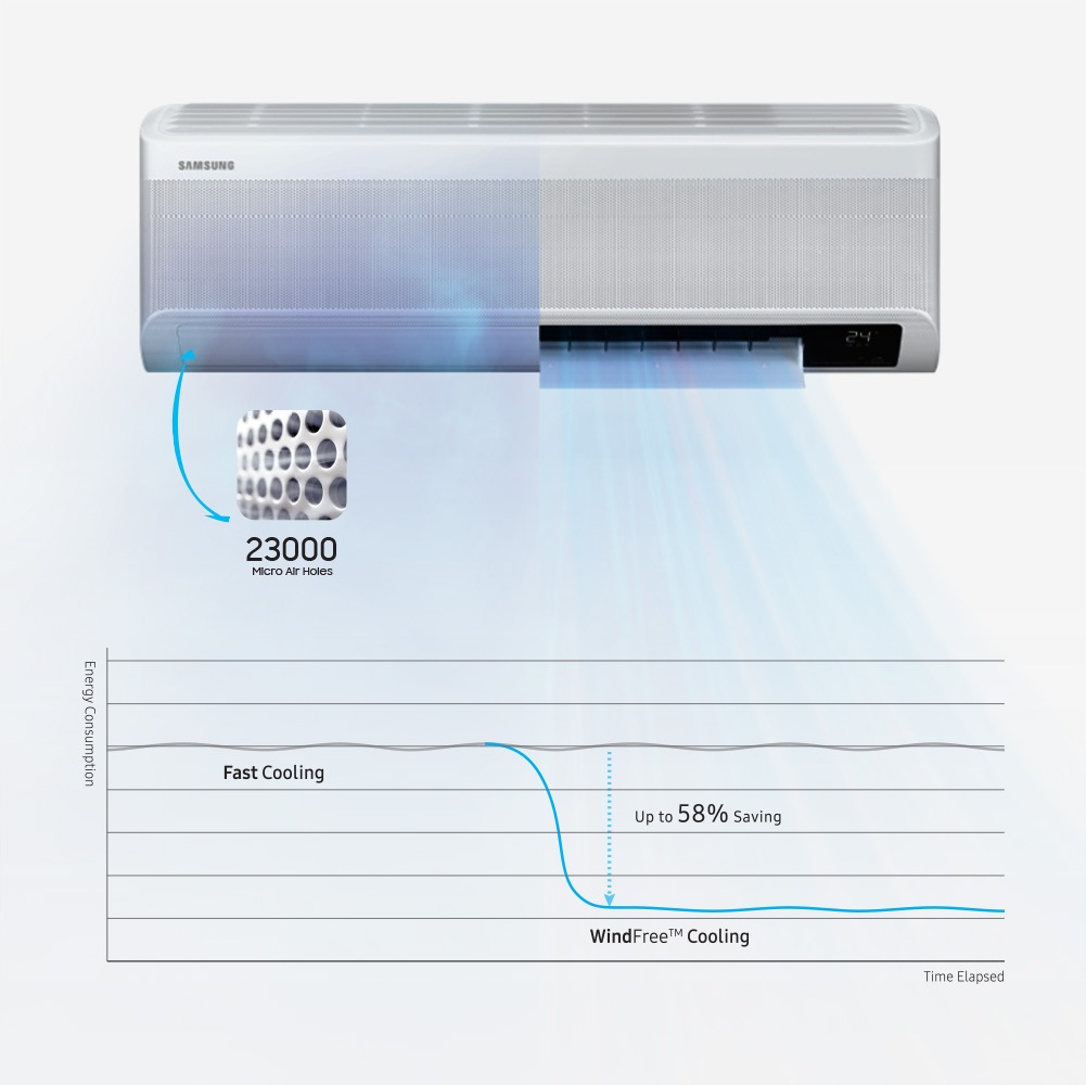 Stay comfortably cool with WindFree™ Cooling. It cools gently and quietly without the unpleasant feeling of cold wind on your skin, as it disperses air through 23000 micro air holes. It creates a “Still Air” environment* with a very low air speed and much less noise**. Its advanced air flow structure also means it cools a wider and larger area more evenly. And it consumes 58% less energy than normal cooling mode*** so you can stay comfortably cool without worrying about electricity bills.