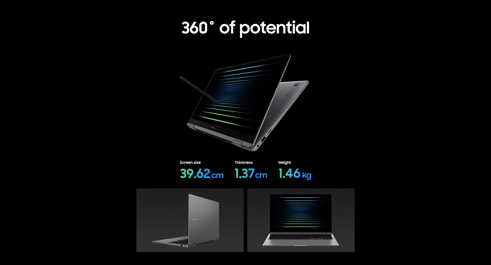 8. Galaxy Book5 Pro 35.56 cm weighs 1.23 kg. Galaxy Book5 Pro 40.62 cm weighs 1.56 kg.