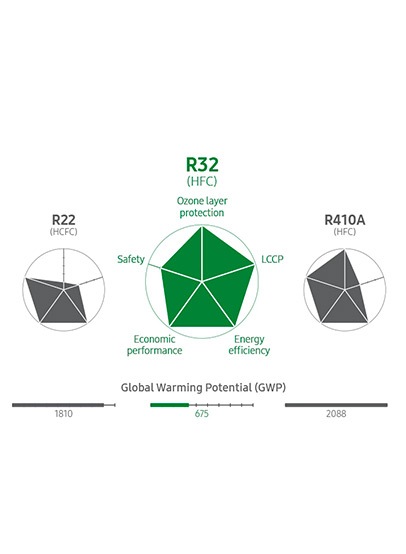 - *Tested on R32 refrigerant compared with Samsung conventional refrigerants R410A and R22.