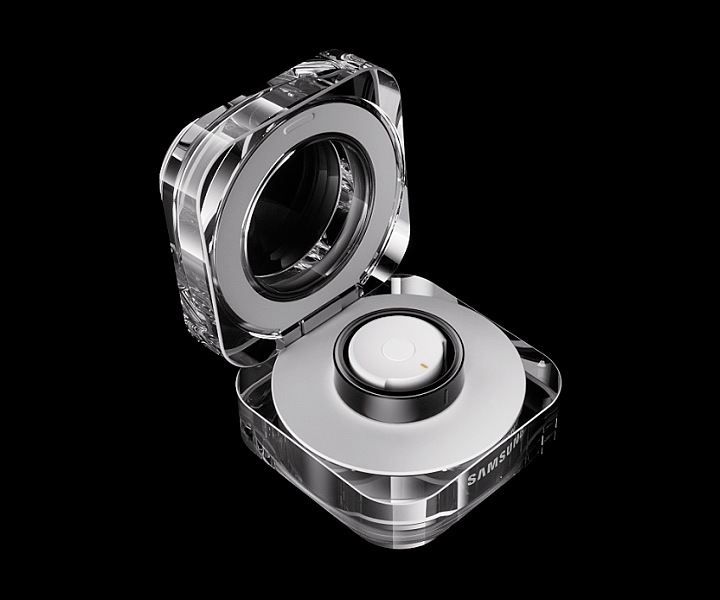 Even while charging in its crystal-clear Charging Case, the Galaxy Ring is a sight to behold. The delicate glow of the light around the Multi-purpose button indicates the battery charging level. The Charging Case can be charged wirelessly too, so simply place your Galaxy Ring securely in its case when you're on the go, and place it on a wireless charging pad for easy charging. , ,
