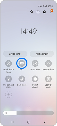 - Open the Notifications panel by swiping down from the top of the screen and select the DeX icon in the “Quick settings” menu.