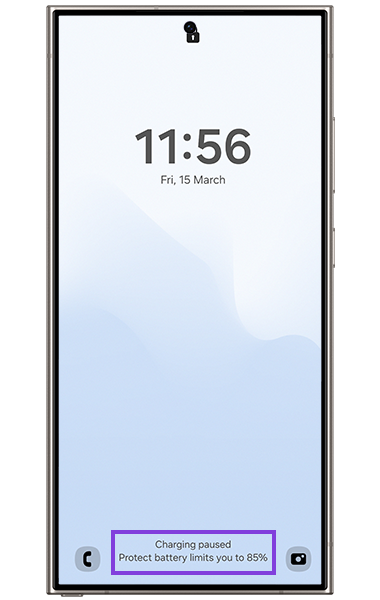 बैटरी सुरक्षा सुविधा Galaxy स्मार्टफ़ोन में उपलब्ध है, जो आपके फ़ोन की बैटरी के चार्ज स्तर को प्रबंधित करके और ओवरचार्जिंग को रोककर उसकी लाइफ बढ़ाने के लिए डिज़ाइन की गई है। डिफ़ॉल्ट रूप से, यह सेटिंग बंद रहती है; हालाँकि, सक्रिय होने पर, यह बैटरी चार्ज को 85% तक सीमित कर देती है। इस सुविधा को बंद करने और अपनी बैटरी को पूरी तरह चार्ज (100% तक) करने के लिए, इन निर्देशों का पालन करें।