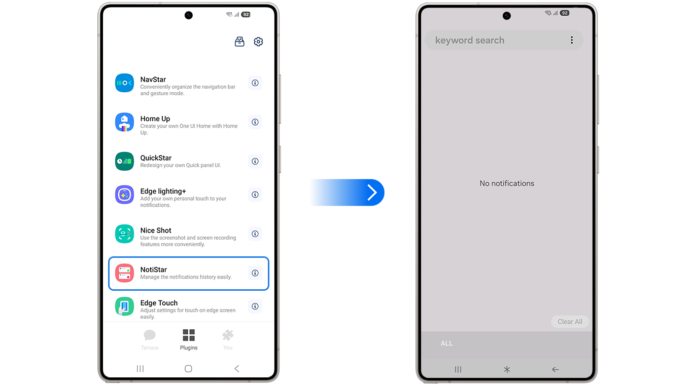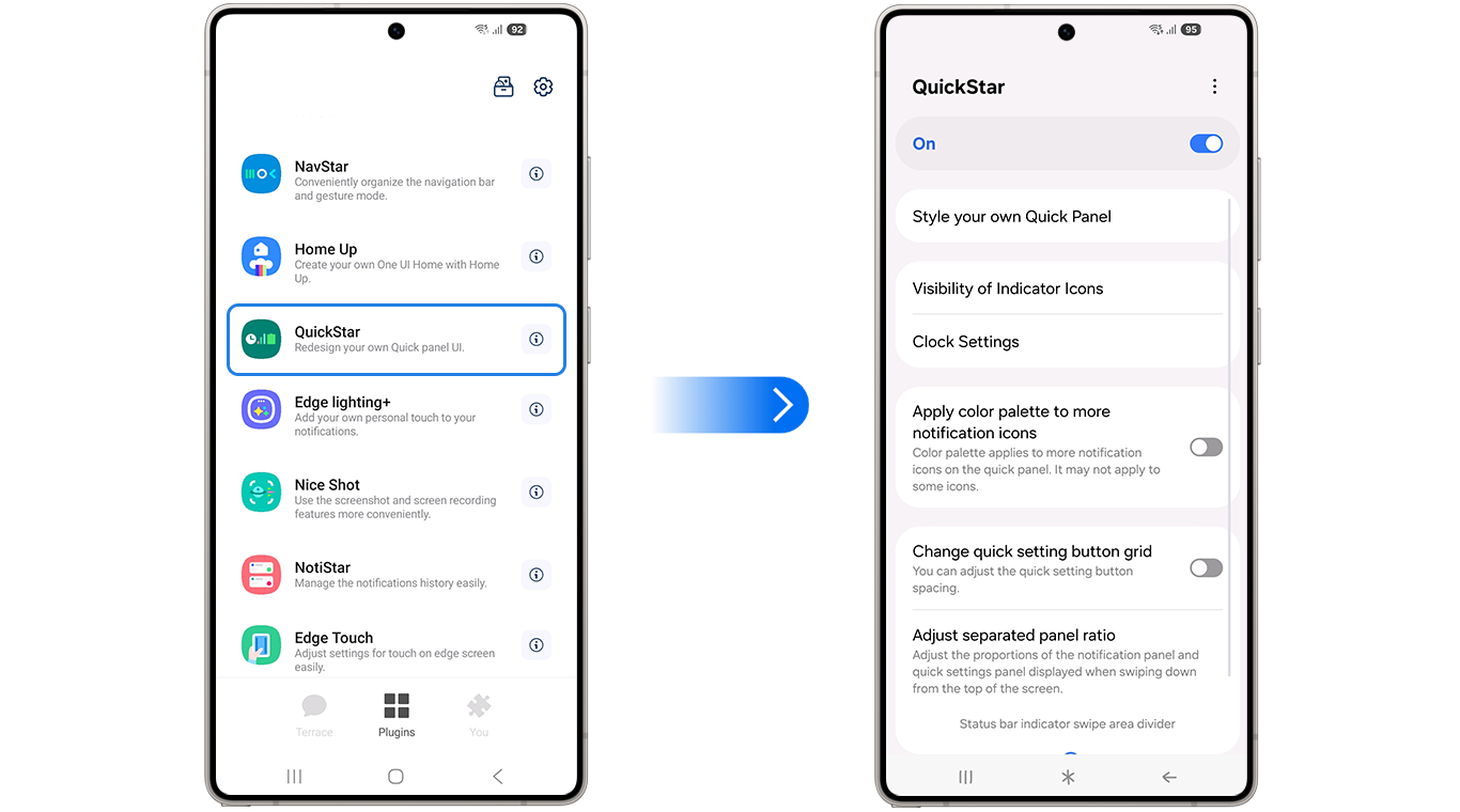 - Quick setting window: Customize the notification panel, quick settings button, and brightness bar