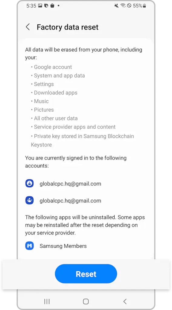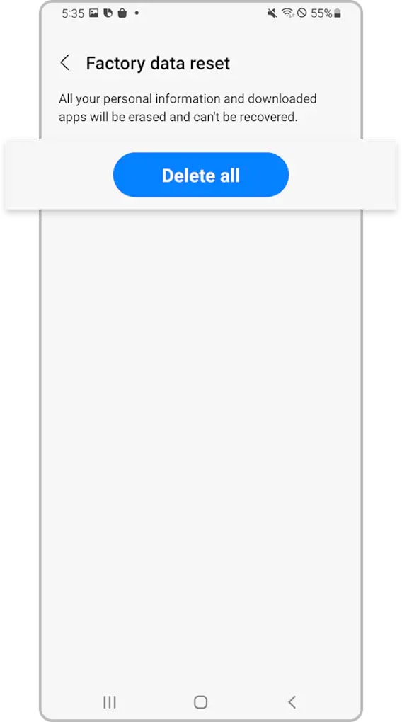 - Before performing a Factory data reset, make sure you have your device's data backed up. Data deleted during a Factory data reset cannot be restored.