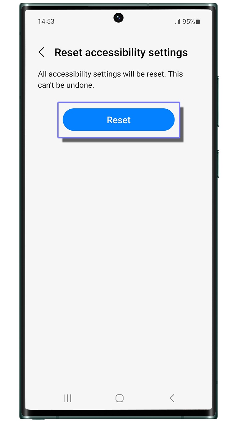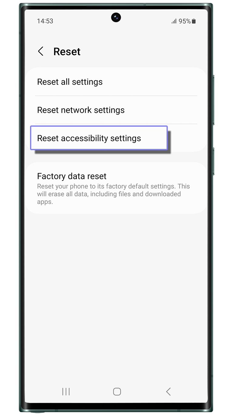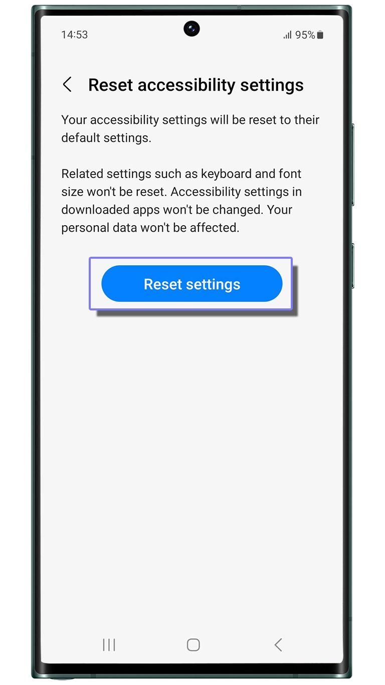 Related settings such as keyboard and font size won't be reset. Accessibility settings in downloaded apps won't be changed. Your personal data won't be affected.