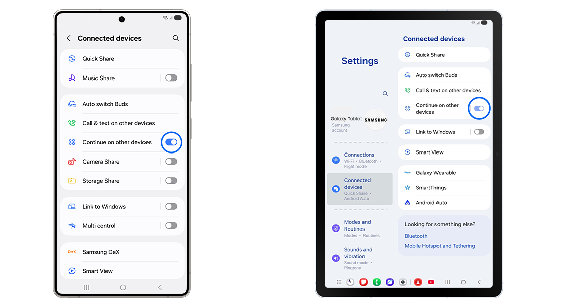 On your Galaxy devices, go to Settings > Connected devices > Continue on other devices* > Enable it.