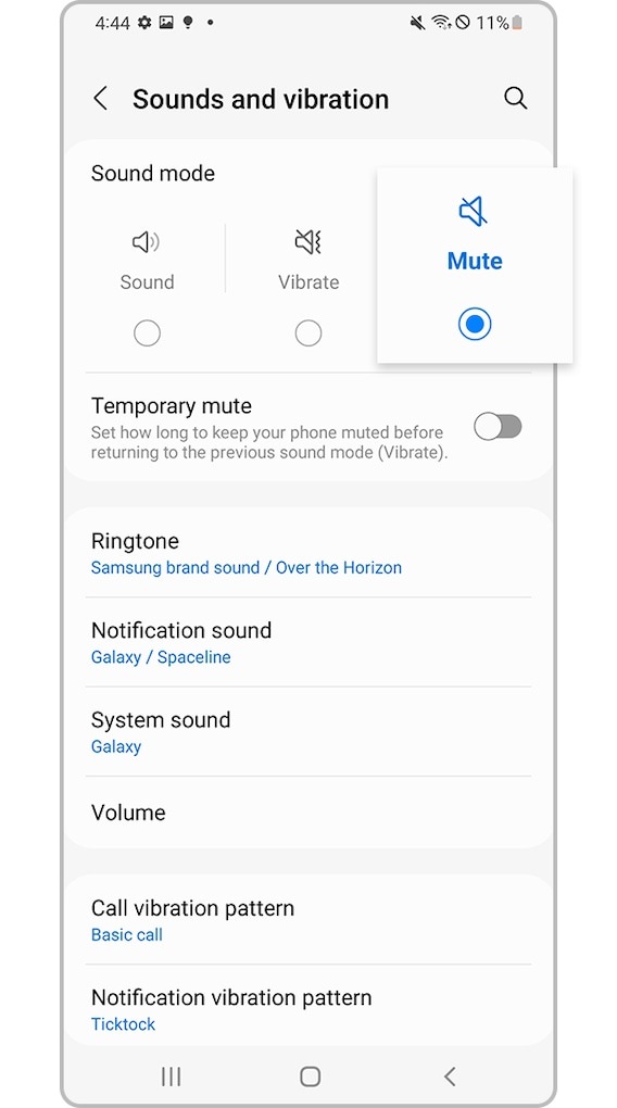 • Mute: Does not make a sound or vibrate when a notification is received. Your device can still play sounds from music or videos.