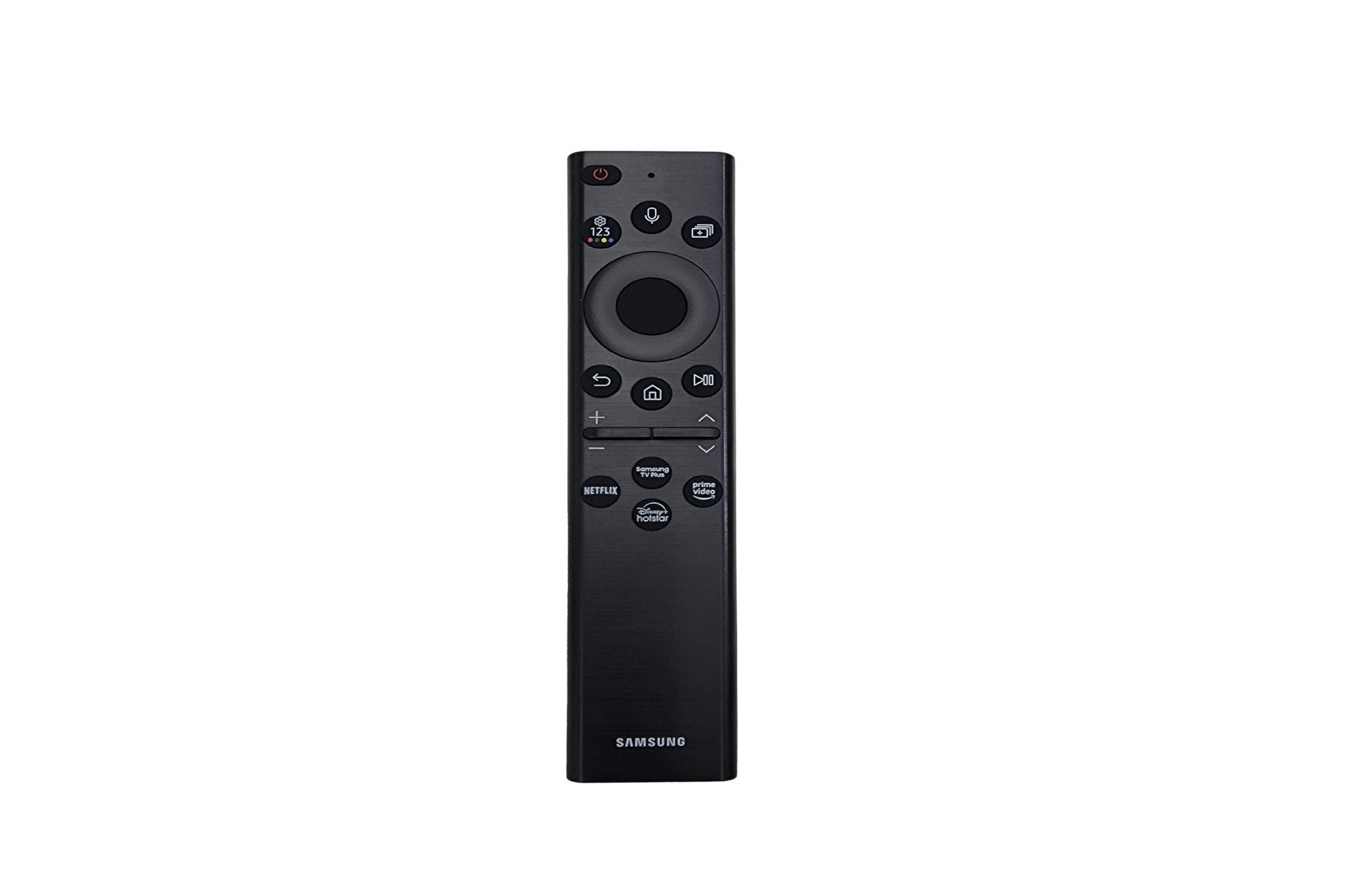 * To charge the remote using solar energy, place the TV remote down with the solar panel facing up. It can be positioned in your living room while the lights are turned on, or near a window to absorb natural sunlight. * In case the remote's battery is depleted, you can charge it using a USB-C cable. To check the remaining battery level of the remote control, refer to the TV Menu (Settings > General Settings > Power & Energy Saving > Available Remote Battery). * The design and button layout of the SolarCell remote may vary depending on the region.