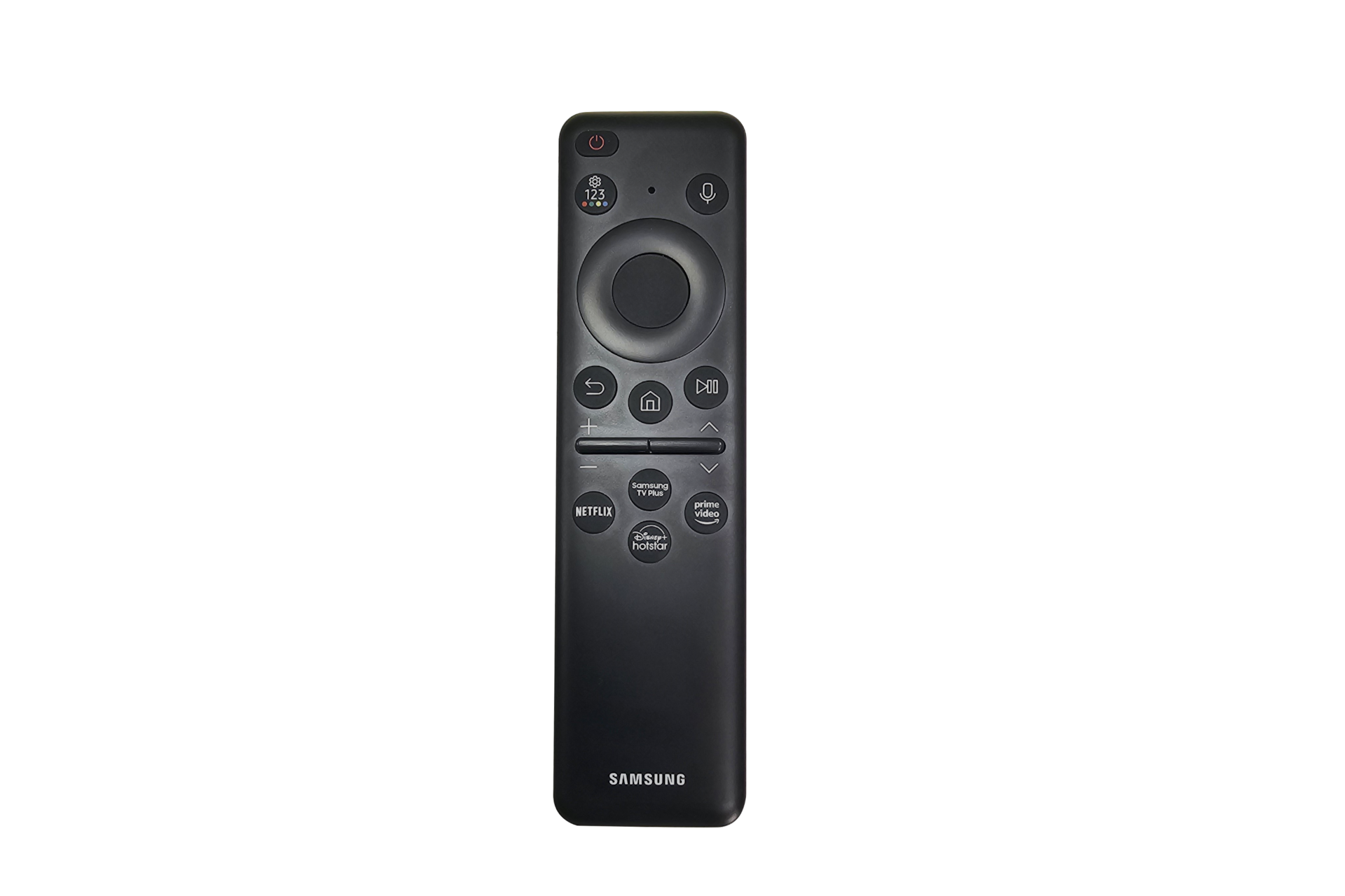 * To charge the remote using solar energy, place the TV remote down with the solar panel facing up. It can be positioned in your living room while the lights are turned on, or near a window to absorb natural sunlight. * In case the remote's battery is depleted, you can charge it using a USB-C cable. To check the remaining battery level of the remote control, refer to the TV Menu (Settings > General Settings > Power & Energy Saving > Available Remote Battery). * The design and button layout of the SolarCell remote may vary depending on the region.