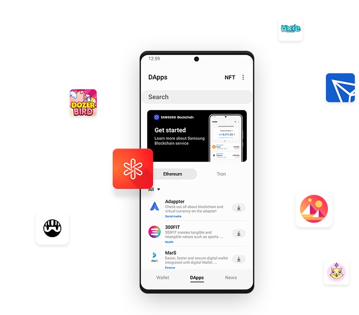 توفر محفظة سامسونج Blockchain Wallet الإدارة الآمنة للأصول الافتراضية للهاتف المحمول.