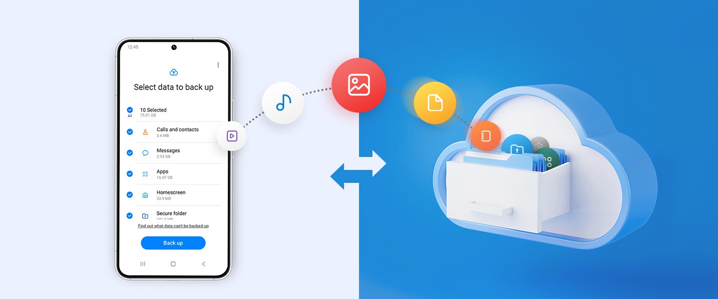 پاشەکەوتکردنی کاتی لەسەر بیرگەی هەوری بەکاربهێنە بۆ ئەوەی زانیارییەکانت لە کاتی چاککردنەوەی مۆبایلە زیرەکەکەتدا بە سەلامەتی هەڵبگریت، یان بۆ گواستنەوەی خێرا و ئاسانی داتا بۆ ئامێرە نوێیەکان بەکاریبهێنە. تەنها پێویستە داتاکانت لەسەر بیرگەی هەوری باربکەیت، کە لەوێ سەلامەت و پارێزراو دەبن، و لە هەر کاتێکدا پێش بەرواری بەسەرچوونەکەی لەسەر ئامێری مەبەست دایبگرەوە. لە وێنە، ڤیدیۆ و تێبینییەکانەوە تا ژمارەکانی پەیوەندی، ڕووداو و بۆنەکانی ناو ساڵنامە و ڕێکخستنەکانی ئامێر، و تەنانەت فایلە نهێنییەکانی ناو فۆڵدەرە پارێزراوەکەت (Secure Folder)، پاشەکەوتکردنی کاتی لەسەر بیرگەی هەوری ئەو شتانە دەگرێتەوە کە بۆ تۆ گرنگن.