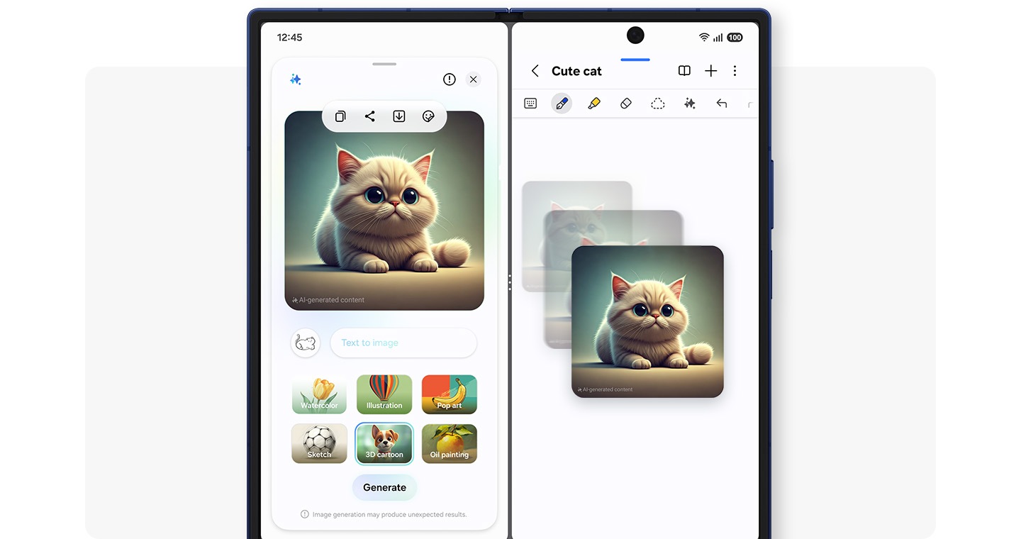 - تایبەتمەندی Generative Edit بۆ Photo Assist پێویستی بە گرێدراویی بە تۆڕێکی ئینتەرنێت و چونەژوورەوەی Samsung Account هەیە. ڕەنگە ئەنجامی دەستکاریکردن بە بەکارهێنانی Generative Edit وێنەیەکی قەبارە گۆڕاو بێت. لە کاتی پاشەکەوتکردنیدا نیشانەیەکی بینراو لەسەر وێنە بەرهەمهێنراوەکە دادەنرێت بۆ ئەوەی ئاماژە بەوە بکات کە وێنەکە لە لایەن ژیریی دەستکردەوە دروستکراوە. دروستیی و متمانە بە دەرەنجامە دروستکراوەکە گەرەنتی نەکراوە.