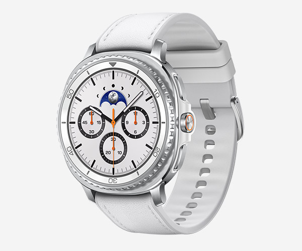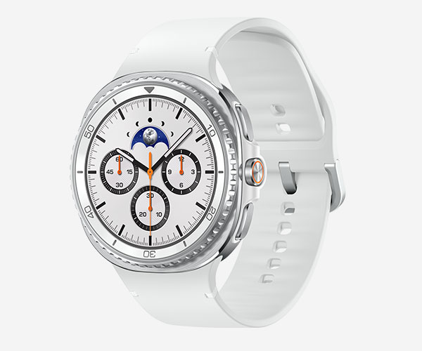 Three different views of Galaxy Watch8 Classic in White. Partial view of Galaxy Watch8 Classic in close-up. Full front view of Galaxy Watch8 Classic. Side view of Galaxy Watch8 Classic, emphasizing the Rotating Bezel.