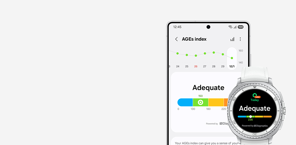 - سنجش شاخص «محصولات نهایی گلیکاسیون پیشرفته» (AGEs) مستلزم ورود به Samsung Account و استفاده از برنامه Samsung Health نسخه 6.27 یا بالاتر است. در دستگاههای دارای Android OS 10 (معروف به Q OS) یا بالاتر در دسترس است. کاربر باید پیش از خواب Galaxy Watch بپوشد. استفاده برای تشخیص، شناسایی یا درمان مشکلات جسمی ممنوع است. شاخص AGEs فقط مصرف شخصی دارد. لطفاً برای دریافت مشاوره با یک پزشک متخصص مشورت کنید.