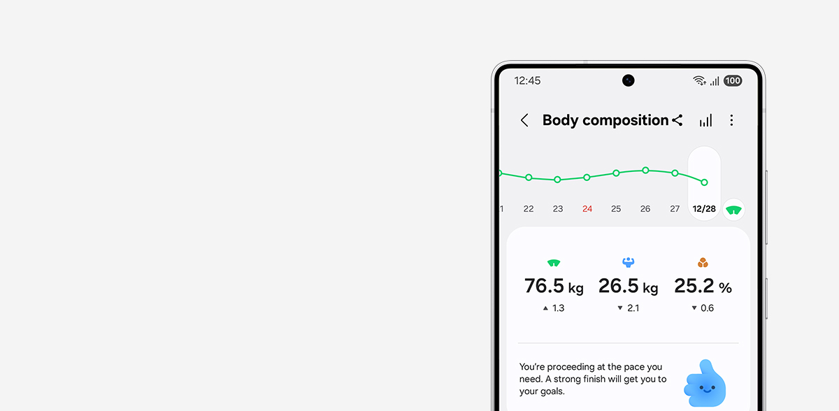 - قابلیت ارزیابی ترکیب بدن فقط در سری Samsung Galaxy Watch4 و مدلهای Galaxy Watch که بعد از این سری عرضه شدهاند، پشتیبانی میشود. استفاده از قابلیت ارزیابی ترکیب بدن برای زنان باردار و افرادی که از ضربانساز یا دیگر ایمپلنتهای پزشکی استفاده میکنند ممنوع است. اطلاعات مرتبط با سلامت که از طریق دستگاه و برنامه ارائه میشود، نباید توصیه پزشکی تلقی شود. نتایج اندازهگیری برای افراد زیر 20 سال ممکن است دقیق نباشد. اندازهگیریها فقط برای مصرف شخصی شما است. لطفاً برای دریافت مشاوره با یک پزشک متخصص مشورت کنید.