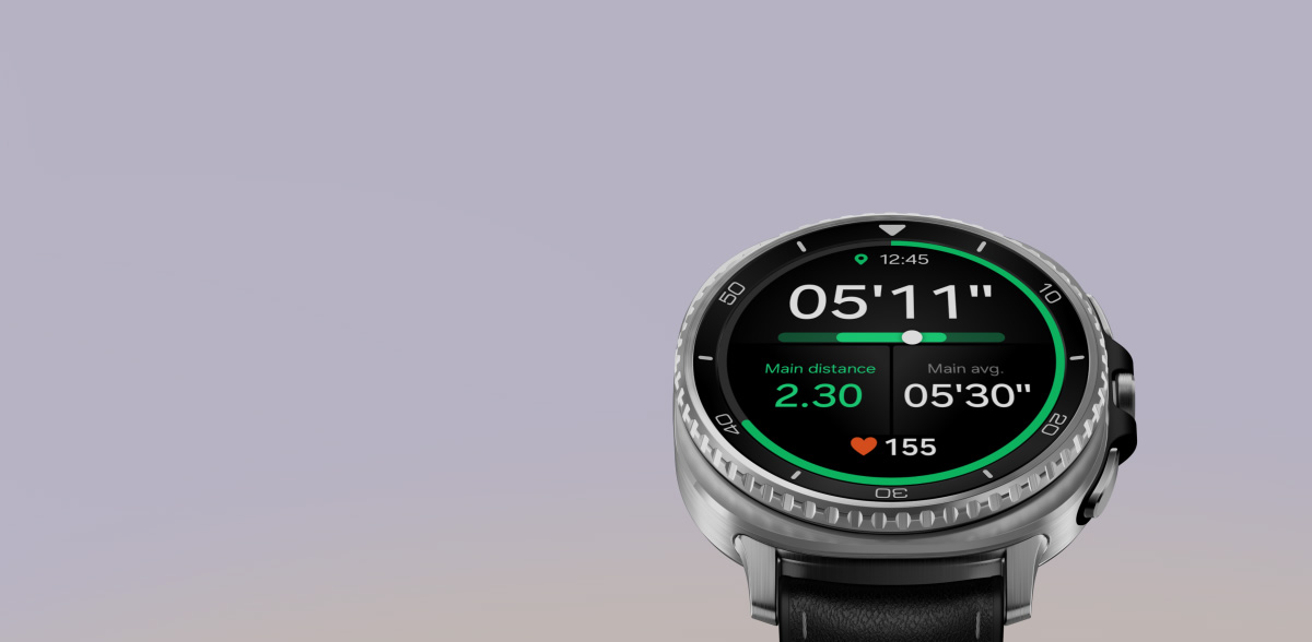 Slightly tilted Galaxy Watch8 Classic is on one side with Running coaching feature onscreen. In the back, running icon can be seen to indicate progress. Text Your running level. Number 2. Screen scrolls down, showing two buttons: View training plan and Show on phone. Galaxy Watch8 Classic turns to face the front. Onscreen, text Beta, Running coach, text 1 Hill training, 4.00 kilometers, 4.31 kilometers. Workout 1 to 4 in the background to indicate that you can check your running level through 4 steps. Galaxy Watch8 Classic displaying 12:45, 5 minutes 15 seconds, Main distance 2.33, Main average 5 minutes 30 seconds, heart rate 165. Galaxy Watch8 Classic tilts backwards and display dims. Above the device are checkmark icon and text Passed!. Confetti can be seen, indicating the user reached an exercise milestone. Number 3 icon that indicates running level 3 appears above Galaxy Watch8 Classic.