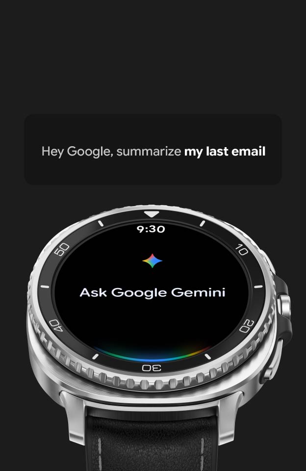 Galaxy Watch8 Classic slightly tilted. Traditional watch-like watch face onscreen. Text box that indicates the voice command feature of Google Gemini. Text Hey Google, Summarize my last email. Watch face changes to Google Gemini. Time at the top, text Ask Google Gemini in the middle.