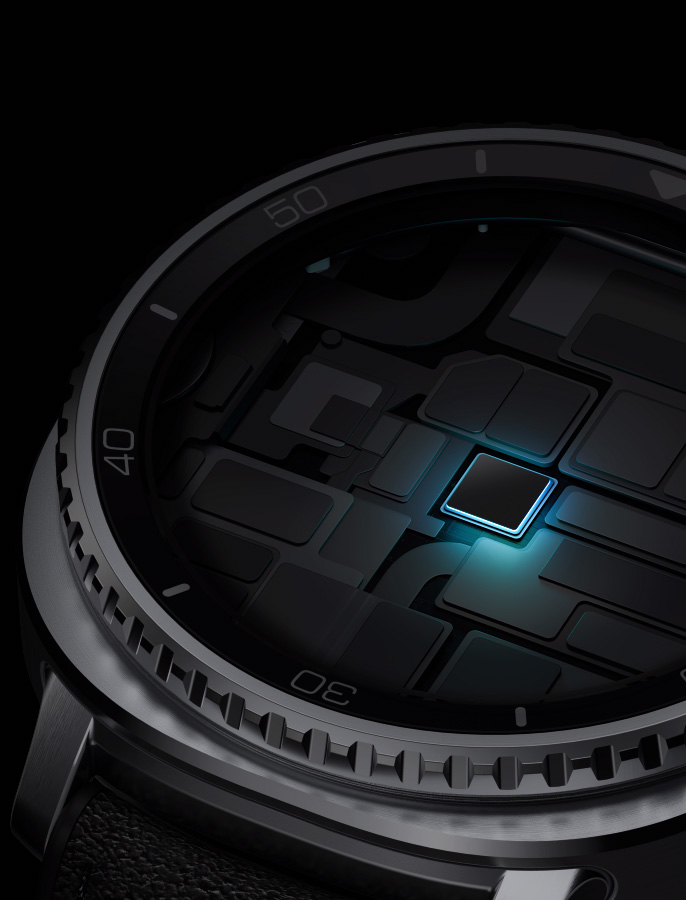 Chipset slightly above its place inside Galaxy Watch8 Classic. Chipset in its place with light glowing around it to emphasize the advanced processor.
