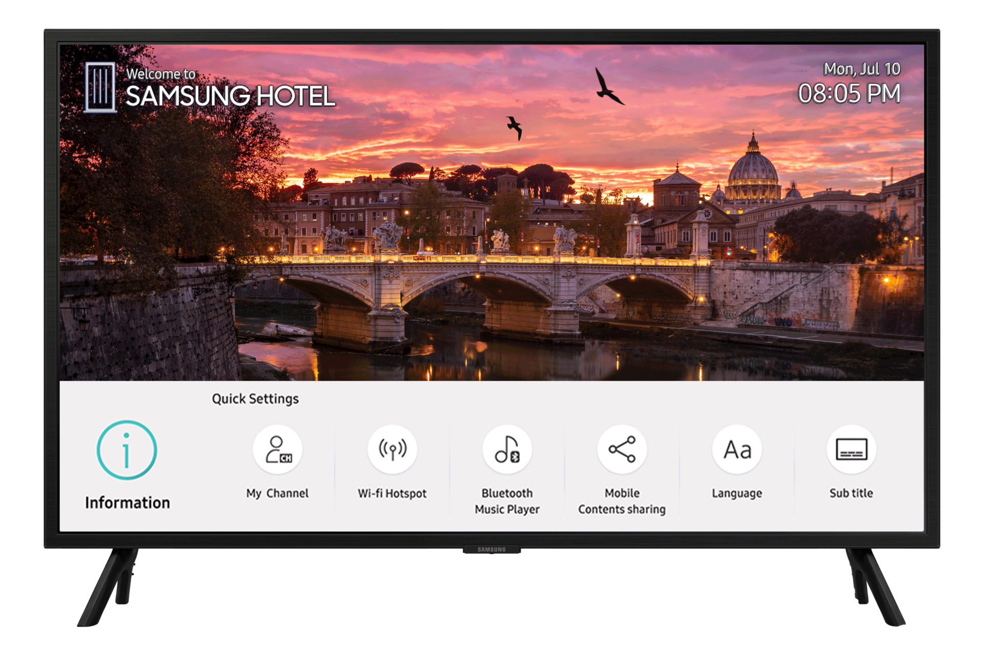 Ciascun display Samsung è dotato di un menu iniziale intuitivo e personalizzabile, ideale per snellire lo scambio di contenuti fra hotel e ospiti. Gli albergatori possono facilmente inserire immagini, logo e icone scegliendoli in base alle esigenze del singolo ospite, alle offerte speciali da promuovere e al rafforzamento del brand.