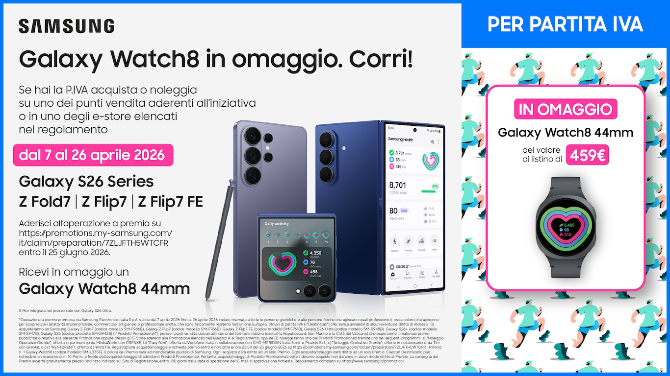 Operazione a premio promossa da Samsung Electronics Italia S.p.A. valida dal 7 aprile 2026 fino al 26 aprile 2026 inclusi, riservata a tutte le persone giuridiche e alle persone fisiche che agiscano quali professionisti, ossia coloro che agiscono per scopi relativi all’attività imprenditoriale, commerciale, artigianale o professionale svolta, che sono fisicamente residenti nell’Unione Europea, titolari di partita IVA (i “Destinatari”) che, senza avvalersi di alcun eventuale diritto di recesso, (i) acquisteranno un Samsung Galaxy Z Fold7 (codice modello SM-F966B), Galaxy Z Flip7 (codice modello SM-F766B), Galaxy Z Flip7 FE (codice modello SM-F761B), Galaxy S26 Ultra (codice modello SM-S948B), Galaxy S26+ (codice modello SM-S947B), Galaxy S26 (codice prodotto SM-S942B) (i “Prodotti Promozionati”), presso i punti vendita ubicati all’interno del territorio italiano (esclusi la Repubblica di San Marino e la Città del Vaticano) che esporranno il materiale promo pubblicitario relativo alla presente Promozione oppure presso gli E-Store aderenti alla Promozione elencati nell’Allegato A al Regolamento; oppure (ii) noleggeranno uno dei Prodotti Promozionati tramite uno dei seguenti programmi: a) “Noleggio Operativo Grenke”, offerto in partnership da MediaWorld con GRENKE; b) “Easy Rent”, offerta da Vodafone Italia in collaborazione con CHG-MERIDIAN Italia S.p.A. e Piramis S.r.l.; c) “Noleggio Operativo Grenke”, offerto in collaborazione da Tim con Grenke; o (iv) “RENT2RENT”, offerto da WindTre. Registrazione acquisto/noleggio e richiesta premio entro e non oltre le ore 23:59 del 25 giugno 2026 su https://promotions.my-samsung.com/it/claim/preparation/7ZLJFTH5WTCFR. Premio: n. 1 Galaxy Watch8 (codice modello SM-L335F). Il colore del Premio sarà ad insindacabile giudizio di Samsung. Ogni acquisto darà diritto ad un solo Premio. Ogni acquisto/noleggio darà diritto ad un solo Premio. Ciascun Destinatario può richiedere un massimo di n. 10 Premi, a fronte dell’acquisto/noleggio di altrettanti Prodotti Promozionati. Pertanto, acquisti/noleggi di Prodotti Promozionati oltre il decimo acquisto non daranno in alcun modo diritto al Premio. La consegna del Premio avverrà gratuitamente presso l’indirizzo indicato sul Sito di Registrazione, entro 180 giorni dalla data di spedizione dell’E-mail di approvazione richiesta. Regolamento completo su https://www.samsung.it/promozioni.