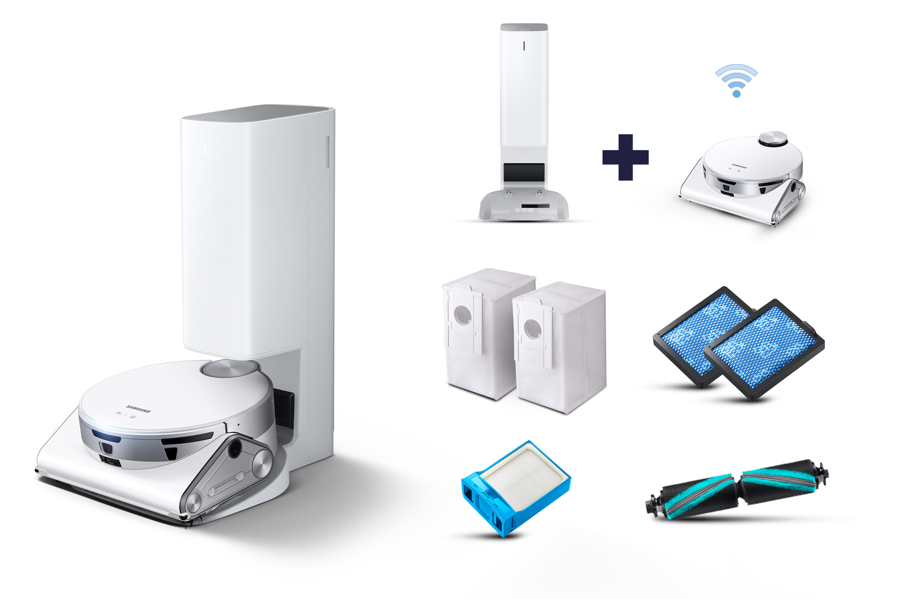 * La disponibilità del servizio può variare in base alla regione.* I comandi di Bixby includono Programmazione, Movimento, Carica, Modifica modalità pulizia, Verifica stato del robot, e Trova robot*** Bixby riconosce solo alcuni accenti e varianti locali di inglese (Regno Unito), inglese (USA), francese (Francia), tedesco (Germania), italiano (Italia), coreano (Corea del Sud), mandarino (Cina), spagnolo (Spagna) e portoghese (Brasile). Altre lingue saranno supportate in futuro. Bixby è disponibile solo su alcuni modelli di smartphone Samsung. È necessario registrare Jet Bot con SmartThings. **** Amazon, Alexa e tutti i marchi e logo correlati sono marchi commerciali di Amazon.com, Inc. o delle sue società affiliate.***** Google e i marchi e logo correlati sono marchi commerciali di Google LLC.Contenuto della confezione