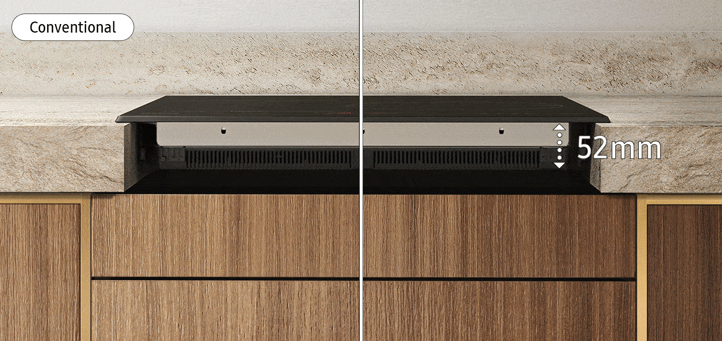 Aggiungi un'utile capienza extra alla tua cucina*. Il design slim fit del piano cottura si armonizza perfettamente con un'ampia varietà di piani di lavoro, a prescindere dal loro spessore. E questo significa che hai più spazio per un cassetto più largo e che è più facile da inserire, riducendo i tempi e i costi di installazione.