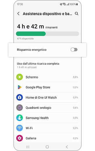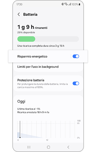 Una volta attivato il “Risparmio energetico”, le app in background verranno escluse dal Wi-Fi e dai dati mobili e le funzionalità che consumano molta energia, come Always On Display, verranno disabilitate per aumentare la durata della batteria.