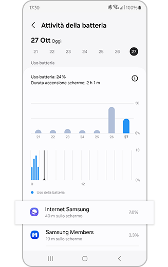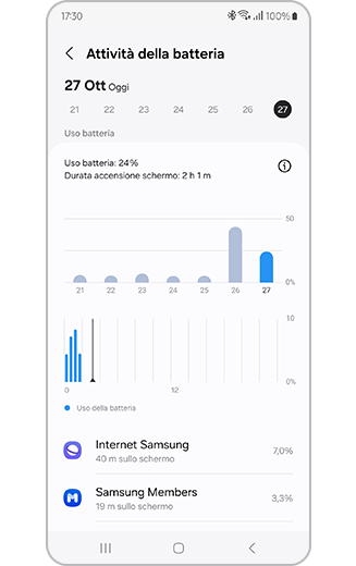 Il display AMOLED del Galaxy ha un elevato rapporto di contrasto che aumenta il consumo della batteria. Il consumo della batteria aumenta anche con una maggiore luminosità dello schermo, intervalli più lunghi prima dello spegnimento dello schermo, app ad alte prestazioni, la riproduzione di contenuti in alta risoluzione, servizi di localizzazione o altri servizi autorizzati.
