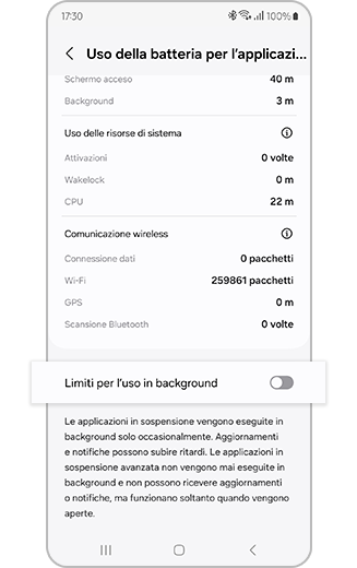 ※ Quando la modalità “Risparmio energetico” è abilitata, le restrizioni dei dati in background verranno applicate a tutte le app e anche i servizi di localizzazione potrebbero essere limitati.