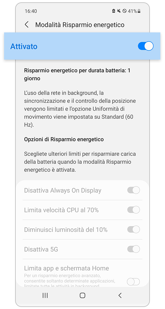 - La “Modalità Risparmio energetico” limita utilizzo di rete, sincronizzazione dei dati e informazioni sulla posizione in background.