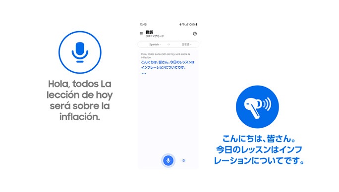 Galaxy AI対応のSamsung Galaxyスマートフォンで外国語を翻訳したり、リアルタイムに翻訳された会話の内容を聞くことができます。