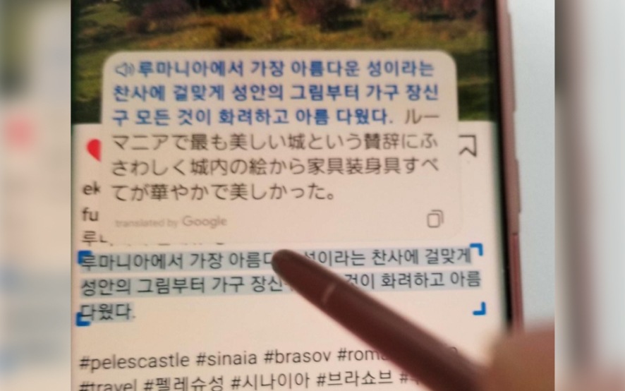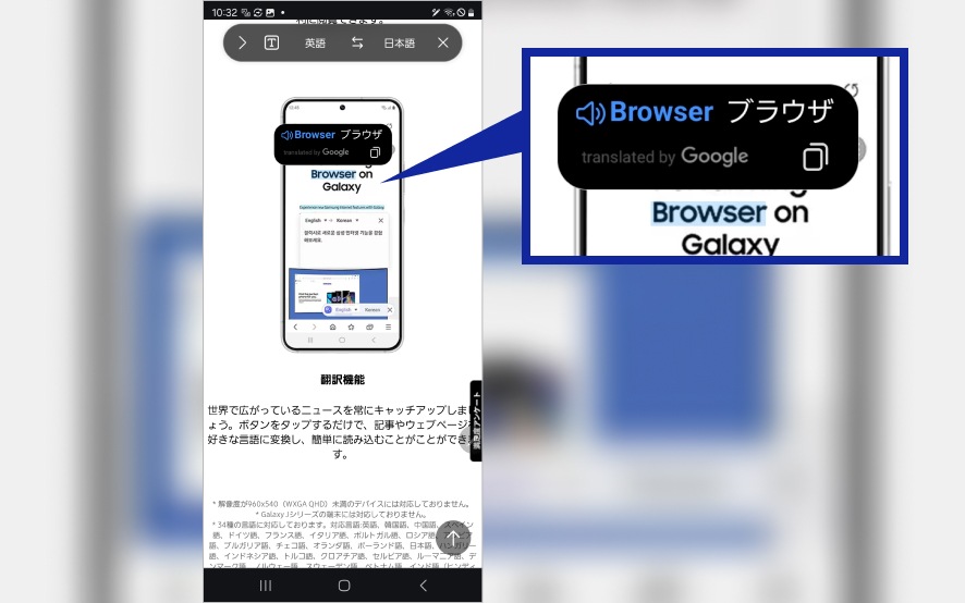 エアコマンドから「翻訳」を選択して、翻訳したいページでSペンをかざせば、該当部分を瞬時に翻訳してくれます。英文の資料をとっさに翻訳したいシーンなどで便利です。