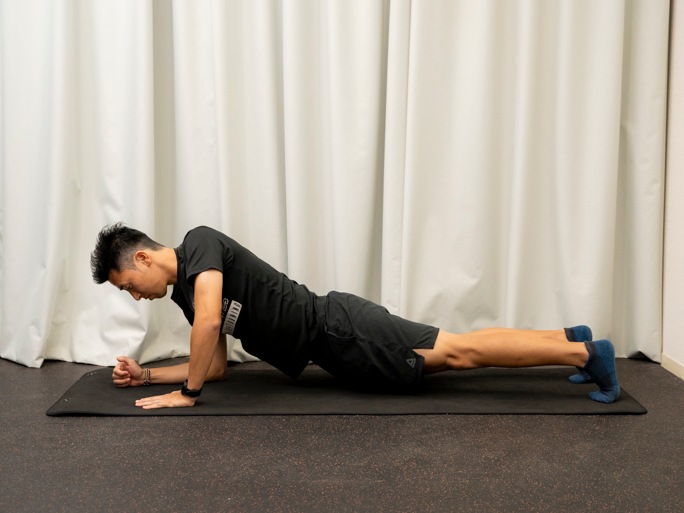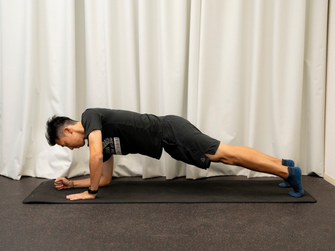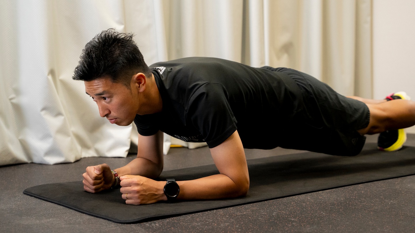 プランクと腕立て伏せを交互に行う運動です。両肘を曲げたプランクの状態から肘を伸ばし、左右順番に体を持ち上げて、落とします。体幹を鍛えながら、腕の筋力も鍛えることができます。