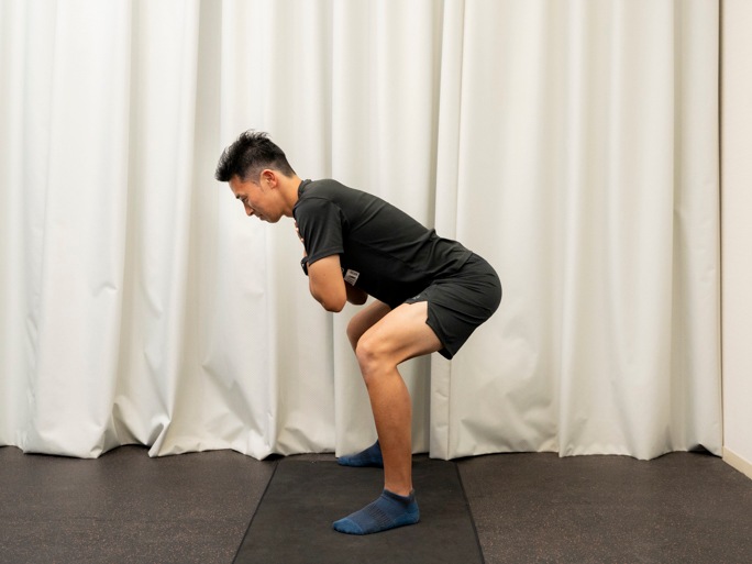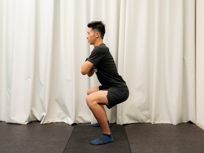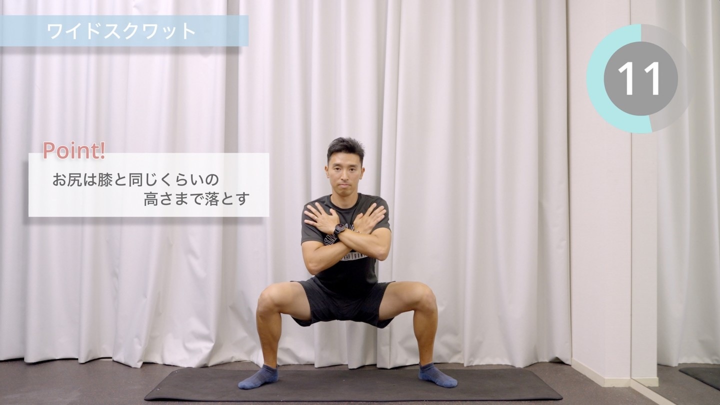 足を「ハ」の字、肩幅より大きく広げ、腕を胸の前でクロスした状態でスクワットします。膝は外に広げ、つま先より前に出ないように、お尻は膝と同じくらいの高さまで落とします。下半身を中心に鍛えられる運動です。