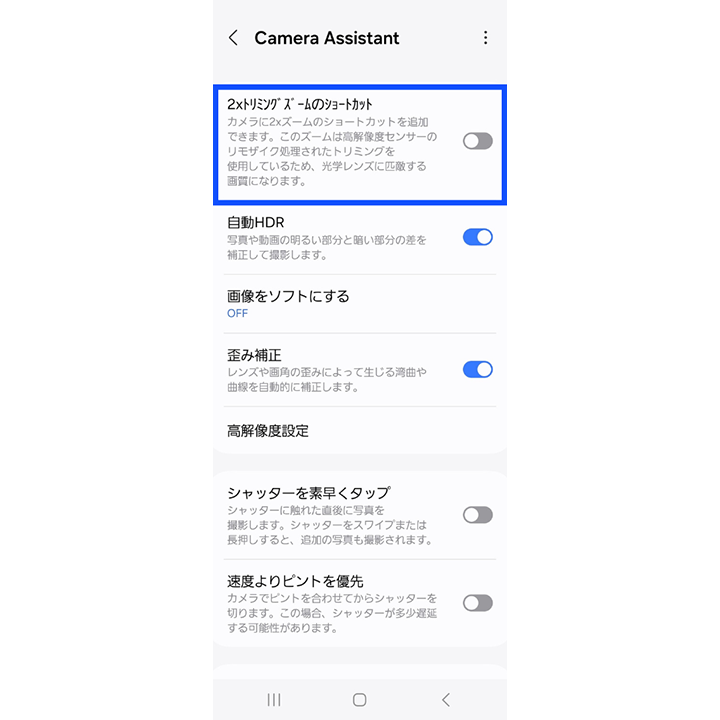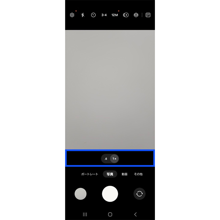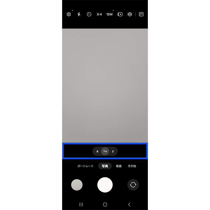 純正のカメラアプリをさらに細かく設定できます。例えば通常のGalaxyのカメラアプリではデフォルトで2種類のズームボタンが表示されていますが、Camera Assistantを使用すれば、デフォルト表示を増やすことが可能です。