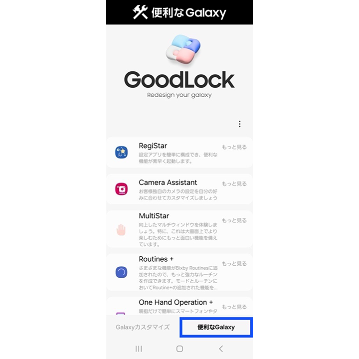 Galaxy専用アプリのため、まずは「Galaxy Store」で「Good Lock」を検索してインストールします。Good Lockアプリを開くと、ページ下部に2つのタブがありそれぞれ一覧で表示されるアプリの中から、使いたいものをインストールすることで機能を利用することができます。左側の「Galaxyカスタマイズ」というタブには、ホーム画面やキーボードなどを自分好みのデザインにカスタマイズできる機能などがメインで入っており、一方右側の「便利なGalaxy」のタブは、自分らしくGalaxyスマホを使いやすくするためのアクション指定や拡張機能などのアプリが入っています。タブを切り替えて自分が使ってみたいアプリを探してみましょう。