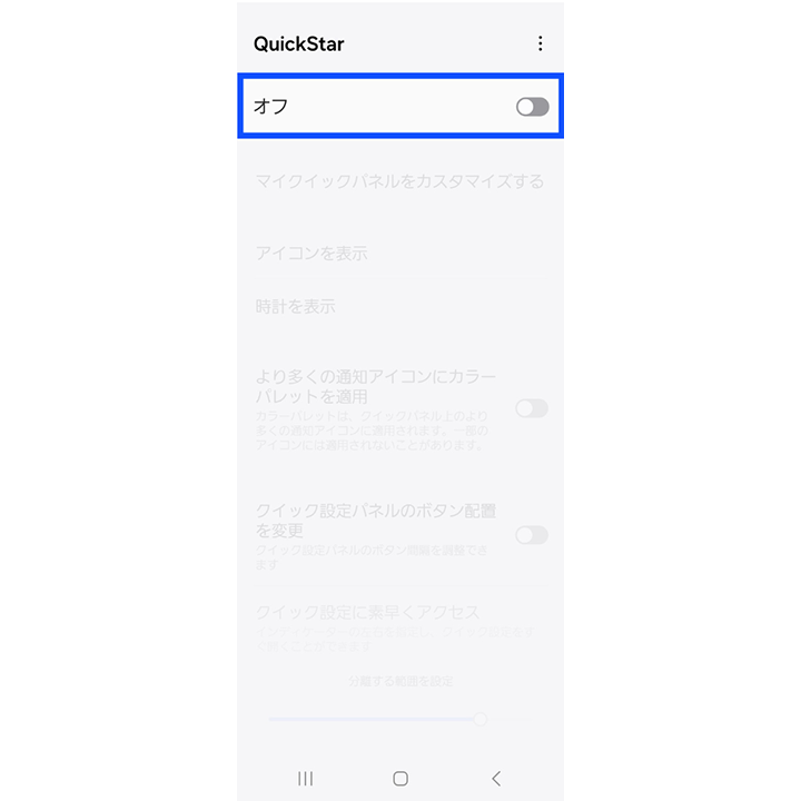 ステータスアイコンの表記変更や、通知バーや時計の表示の切り替え、クイックパネルアイコンの間隔などを設定することが可能です。